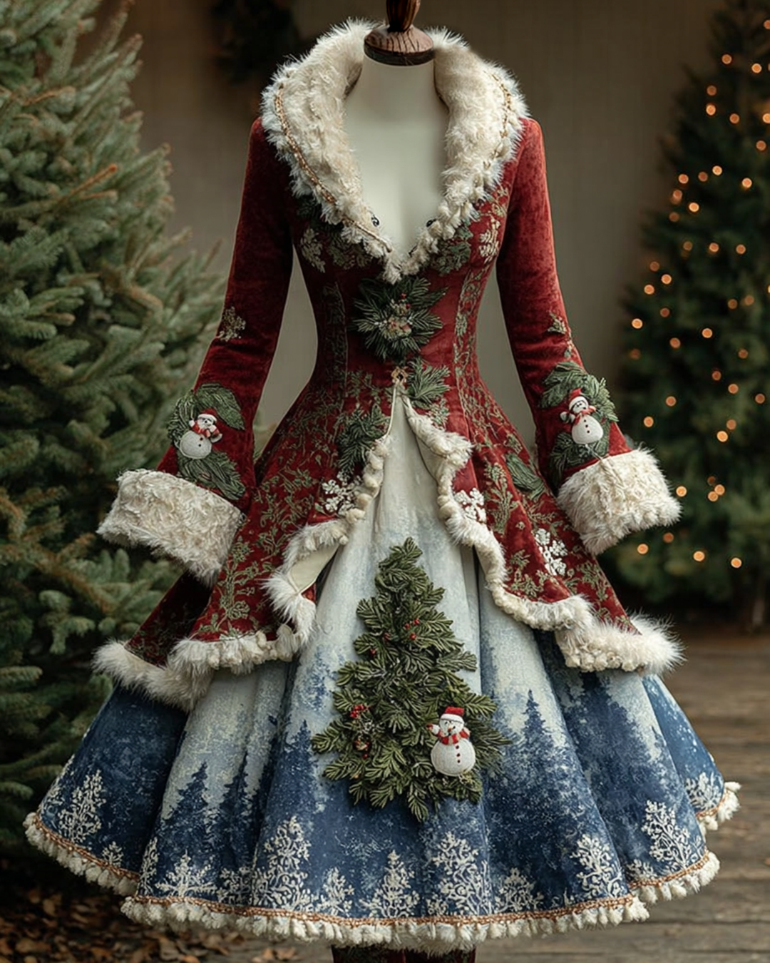 Christmas Themed Contrasting Color Christmas Tree Embroidered Fur Collar Dress 9082