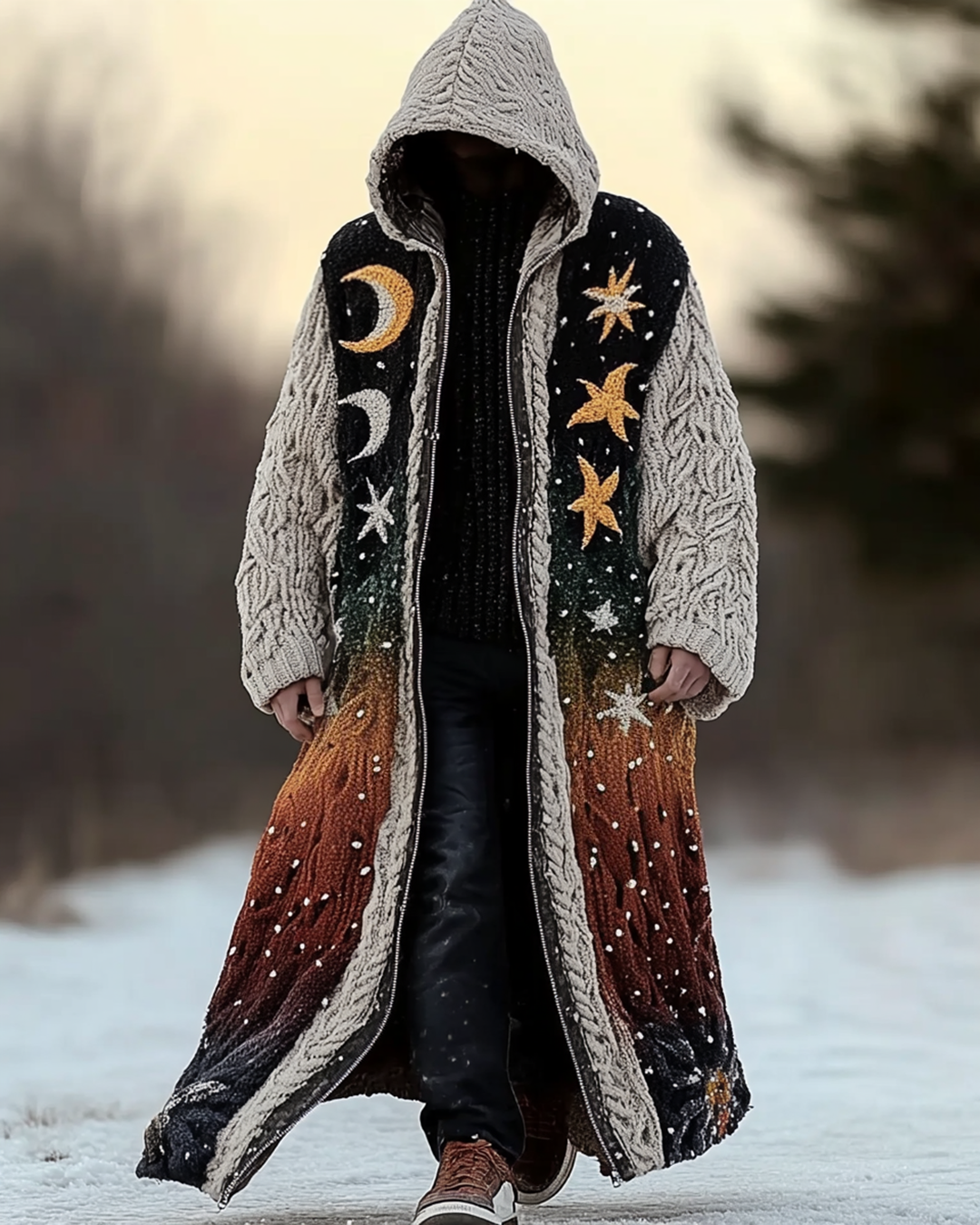 Men's Viking Gradient Star and Moon Embroidered Knit Hooded Jacket 8295