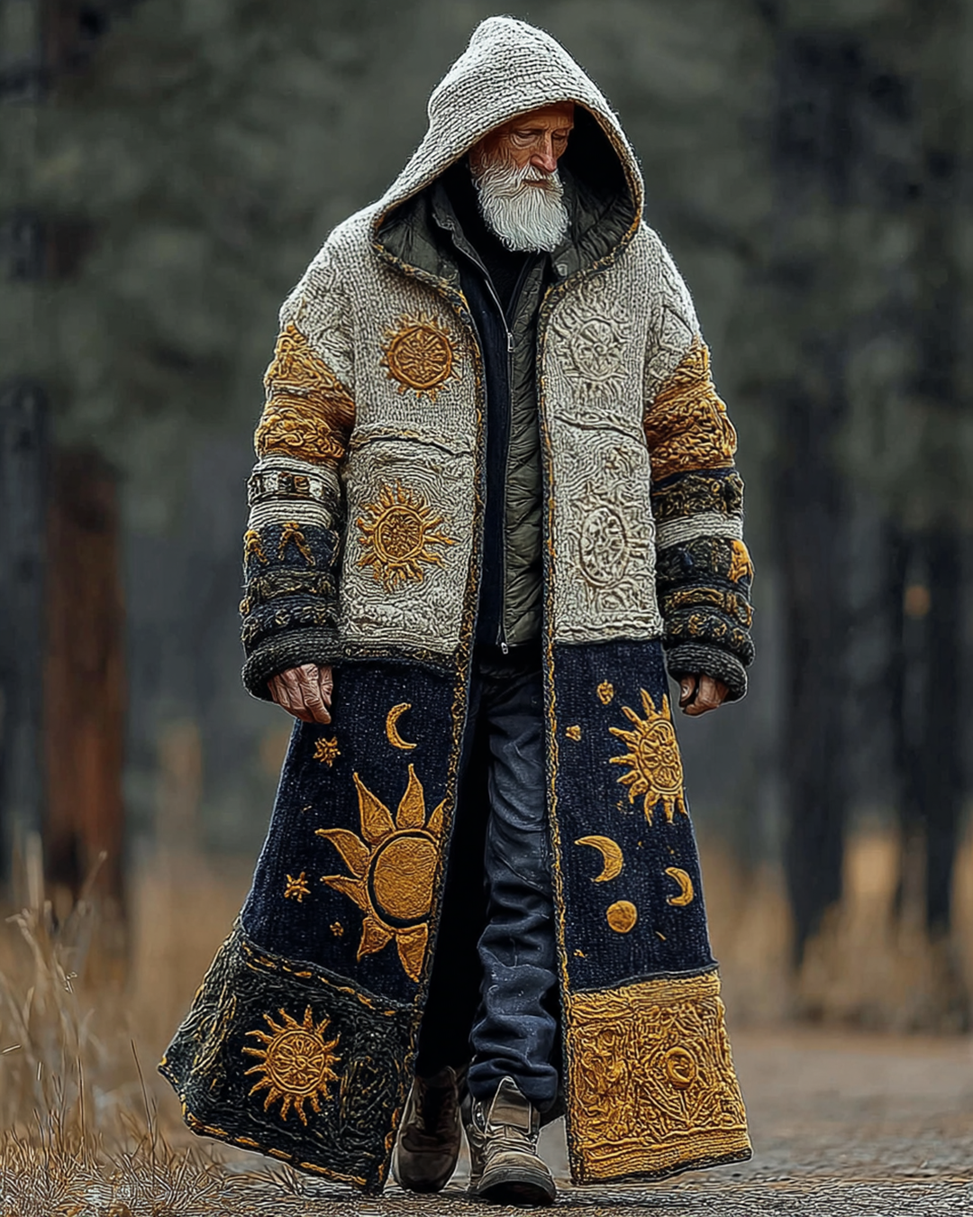 Men's Viking-Themed Contrast-Color Patchwork Star-and-Moon Embroidered Knit Hooded Jacket 8511